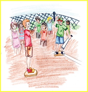 challenges Bully Bam Bam Malone on the neighborhood baseball field.